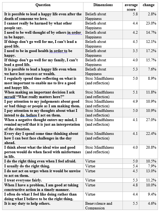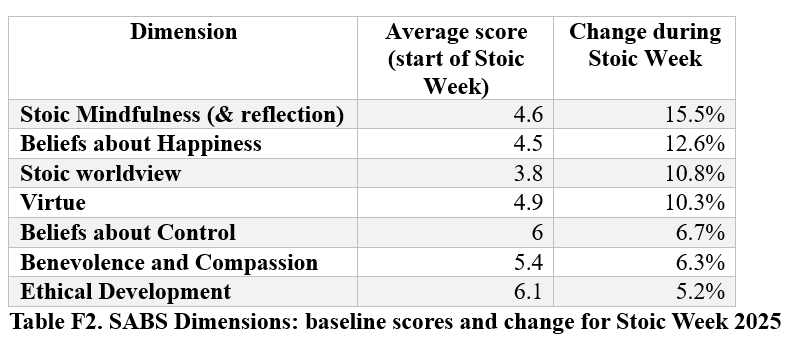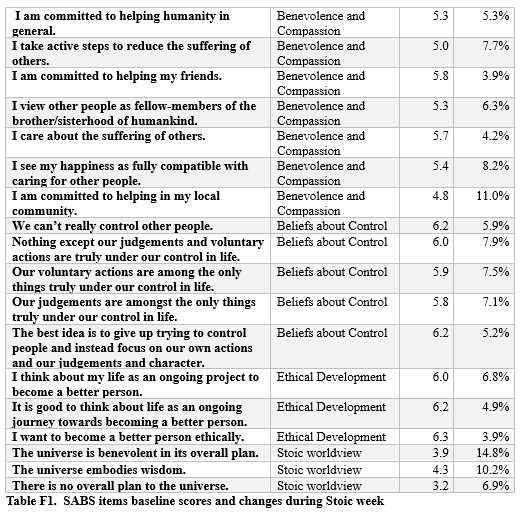Overall Stoicism, as measured by the SABS total score, also increased markedly over the week, indicating that improvements in well-being were accompanied by measurable changes in Stoic attitudes and practices (see Appendix F).