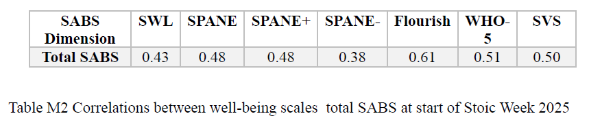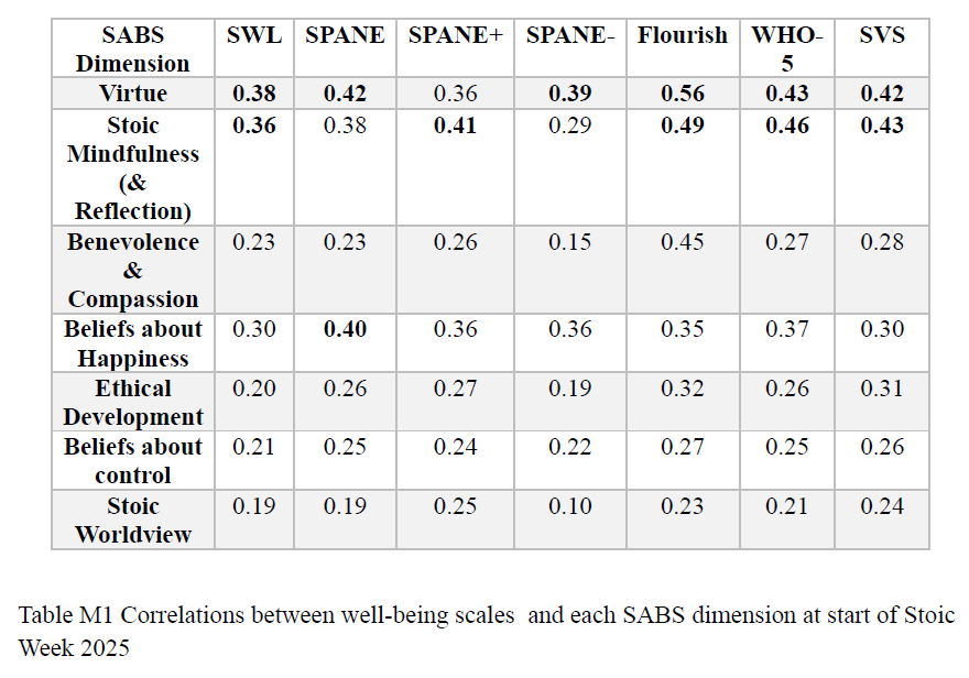 With the publication of the validated SABS, Stoic Week 2025 enables us to ask a more precise question than in previous years: which dimensions of Stoicism are most closely linked to well-being?