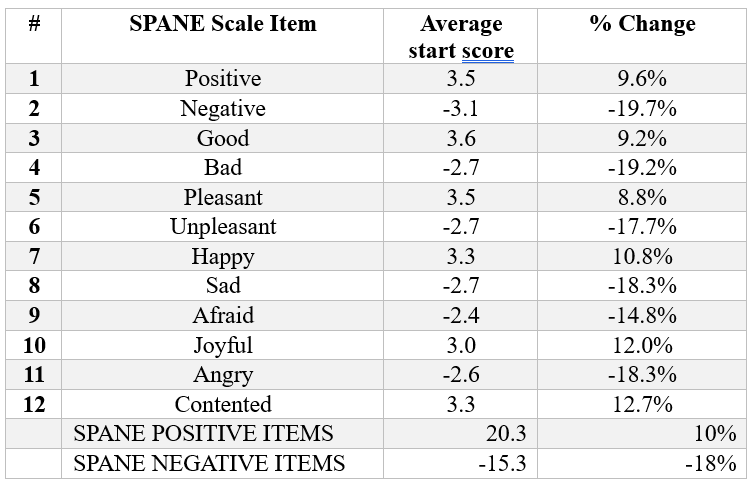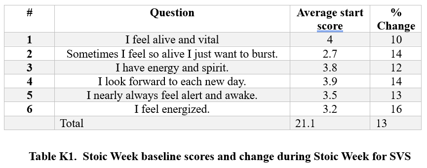 Vitality also increased by 13% over the course of the week, indicating that Stoic practice is associated with greater energy and engagement. Item-level vitality changes are reported in Appendix K.