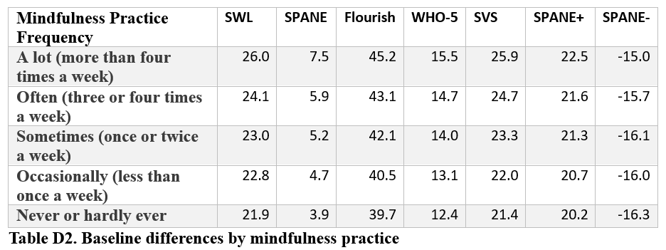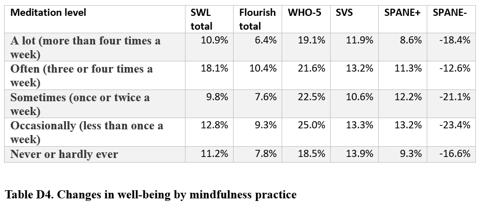 Participants who reported meditating more frequently also reported higher levels of well-being (see Appendix D). The more people meditated, the higher their reported well-being.