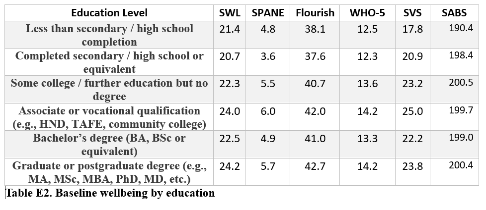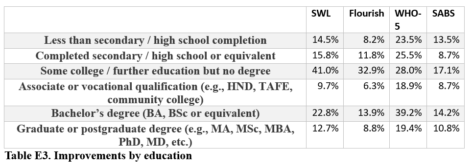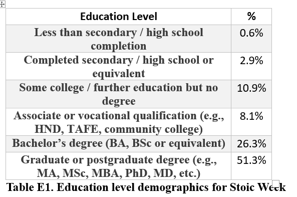 Improvements in well-being and Stoicism were observed across all education levels, with no clear relationship between education and the size of gains in well-being or Stoicism. These findings suggest that Stoic practice is accessible and beneficial across a wide range of educational backgrounds, rather than primarily favouring those with a very high levels of formal education.