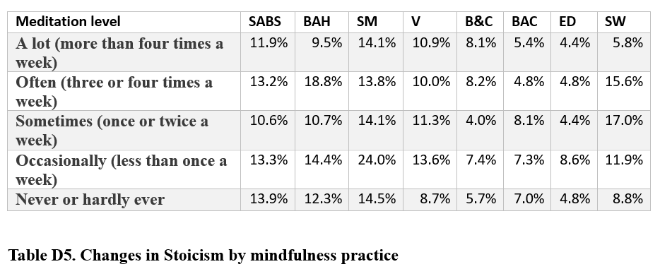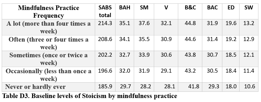 We found that participants who meditated more in general scored correspondingly higher on the SABS. Unsurprisingly, the strongest association was with the Stoic Mindfulness dimension. The Beliefs About Happiness and Virtue dimensions were also strongly associated with mindfulness practice. All seven dimensions showed positive relationships with meditation frequency, suggesting that those who meditate tend to be more Stoic across multiple dimensions, and vice versa. Of course, this association does not establish causal direction.