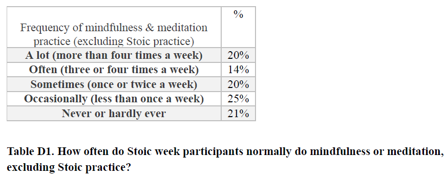 We are often asked how mindfulness practice relates to Stoicism. This year we asked participants whether they had a mindfulness or meditation practice, to explore whether mindfulness enhances the impact of Stoicism or whether it, to some extent, makes Stoic practice redundant.