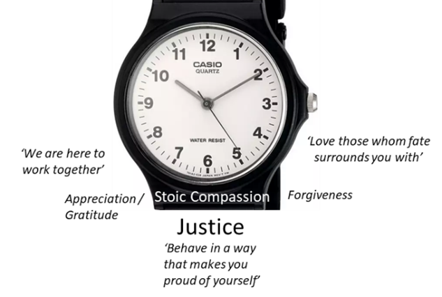 While the top half of the watch face can therefore be captured quite well with the phrase ‘Stoic mindfulness,’ this lower half can be captured quite well with the phrase ‘Stoic compassion’ (big thanks to Donald Robertson for his articles introducing me to these terms). Because the Stoic concept of ‘justice’ doesn’t translate well into English, I also label this ‘social virtue’ in my mind. I use this point to remind myself that I need other people, I am a social being, and I will get back from people what I put in. To this end I also often use the phrase ‘Behave in a way that makes you proud of yourself’ as a subheading to ‘Justice.’ This might be my most powerful phrase, reframing situations from a focus on others’ behaviour to my own as well as towards my own judgement of my actions, rather than relying on others’ opinions. It also often reminds me that the most difficult situations that some might consider disasters are in fact opportunities to make myself proud.